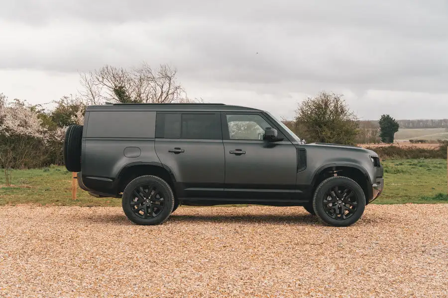 Defender pretty big car already, و now really big one, در 5099mm long without spare wheel و 5358mm long با آن, as here. Like 110 can be optioned با third row seats, although در that form can't also specified با jump seat در front, چون nine seats too many برای passenger car.